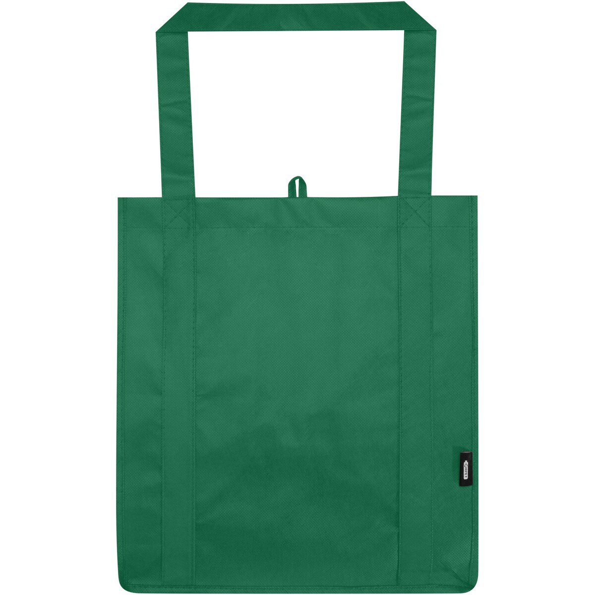 Made from durable and tear resistant non-woven RPET, the Liberty GRS certified recycled tote bag has a supportive bottom board, making it versatile and solid. The tote bag features a large main compartment and 25 cm long handles. Volume capacity: 29 litres. Resistance up to 12 kg weight.